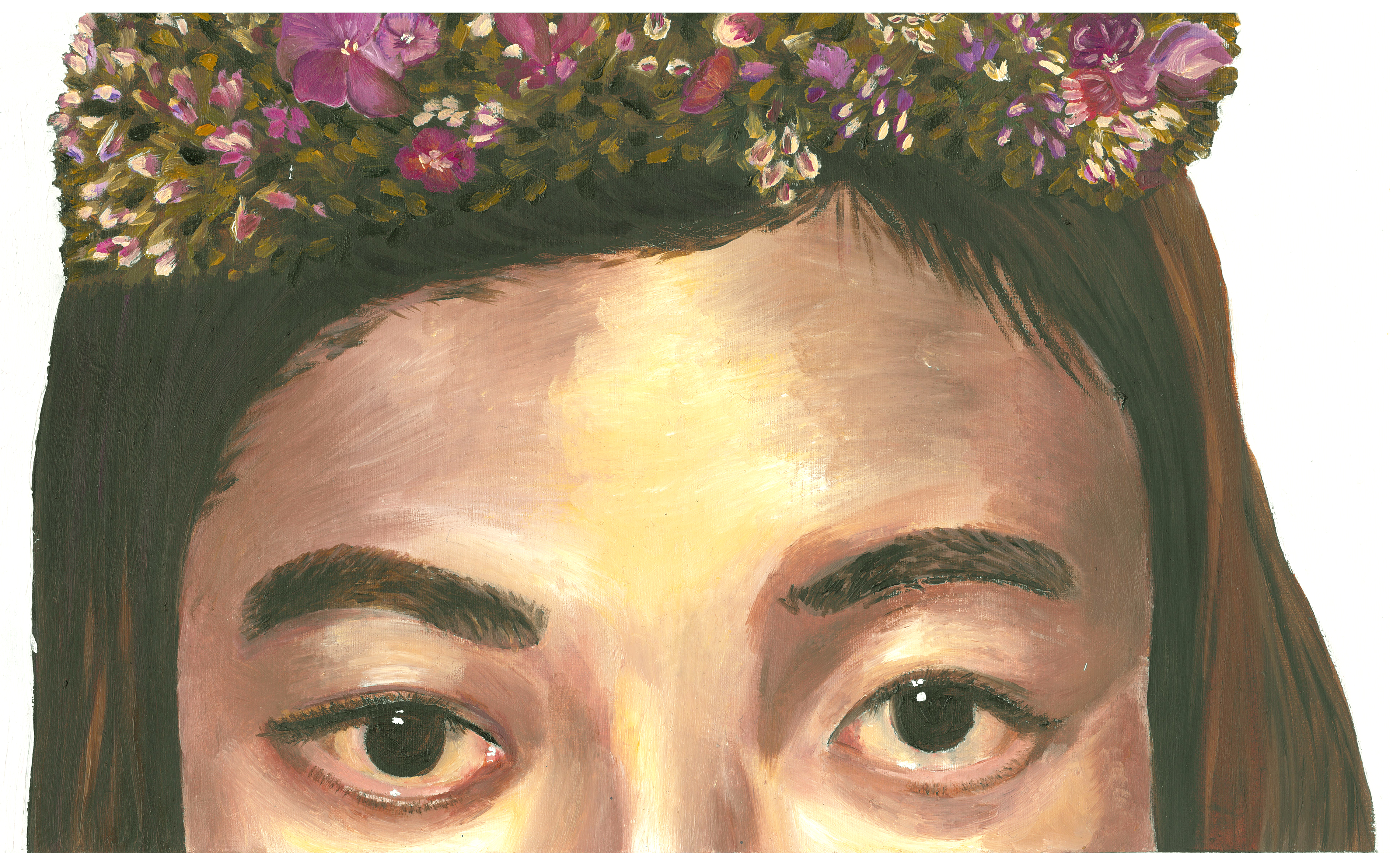 This portrait is a self reflection of my cultural identity and a critic on western stereotypes. The background is a jaded green, a symbol of the Elite in Chinese culture and the rich treasures of morals and values. The color also has an association to the jade jewelry people traditionally wear which is a symbol for family and unity. The flowers are Mei Hua which is a national chinese flower that blooms in late winter and stays until early spring, signifying the welcoming of the new year. In this self portrait, I am wearing a white dress that my mother designed. It is associated with white wedding dresses of the western culture which as a Chinese girl makes me feel lost and confused/isolated in an unfamiliar place with a different culture such as the UK.