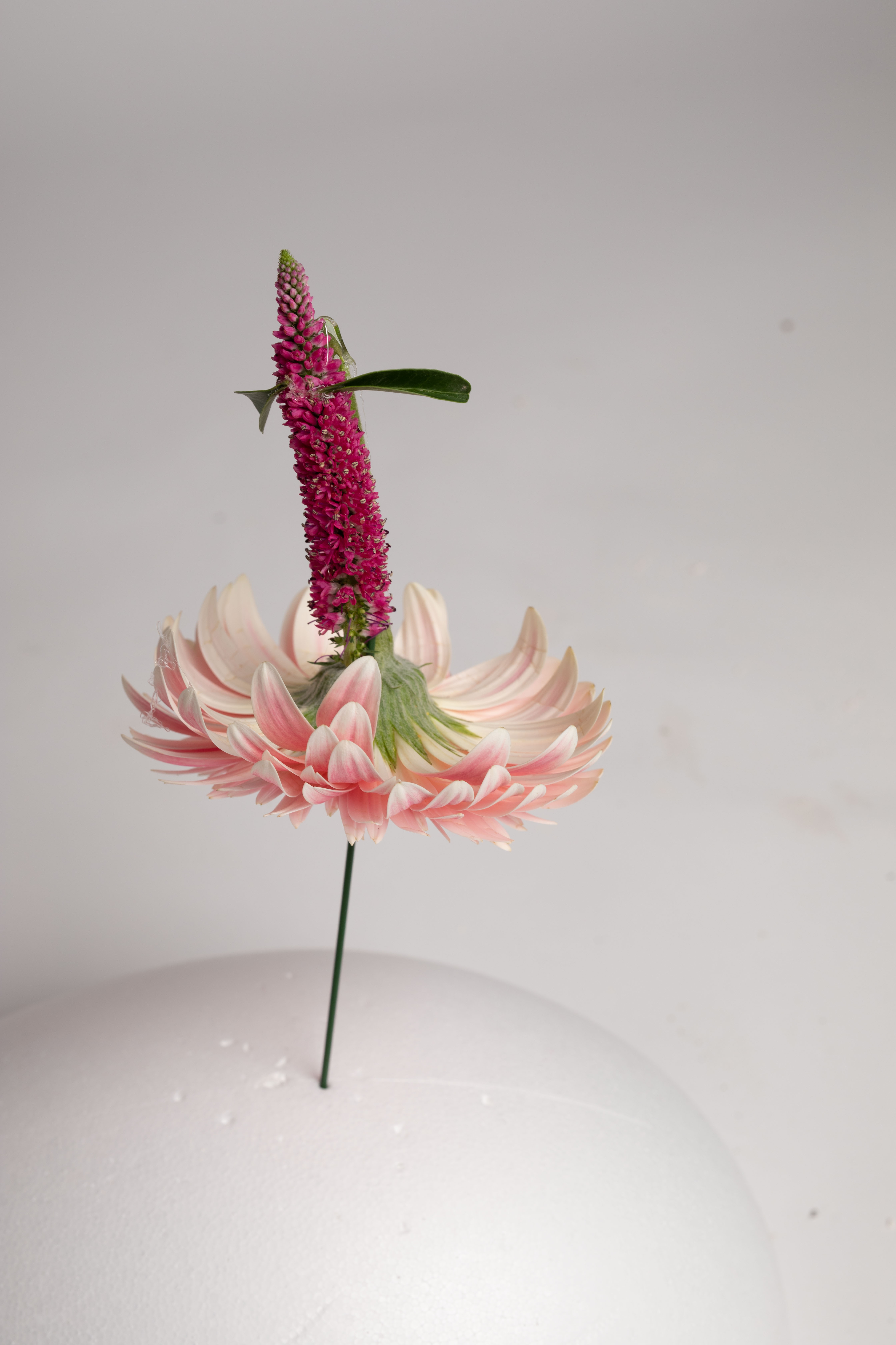 Referencing the Bauhaus Architecture movement, where characters were made from Buildings. These characters were made out of fresh cut flowers. Each of their ‘body parts’ and dresses are made out of different flowers. The combination of flowers and form shows individuality of their characters portraying their personality. They are assembled with a hot glue gun and green wire. The texture and the form of the flowers also played a big role in shaping their silhouette.